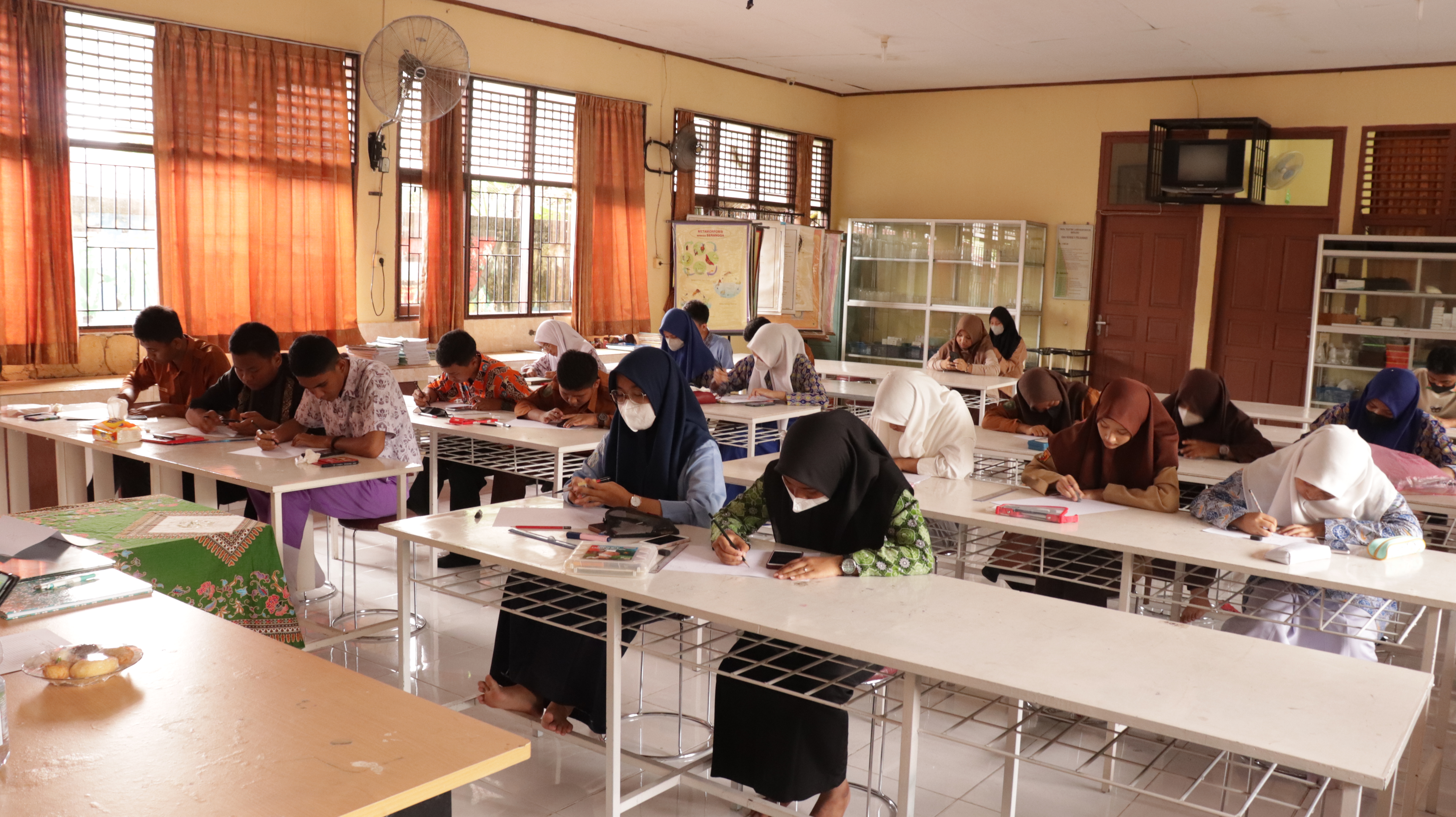 Peserta kaligrafi sedang konsetrasi dalam membuat karya